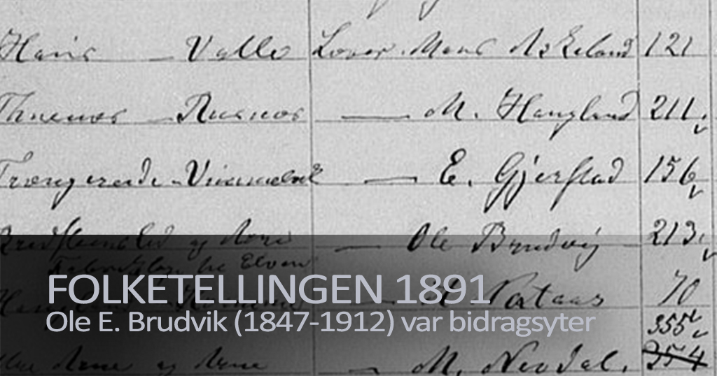Det er ikke lenge siden Arkivverket annonserte at de nå var ferdige med å skanne inn folketellingen 1891. Jeg tok en titt på denne, ikke fordi jeg regnet med å finne noe jeg ikke visste fra før av – men mer av ren nysgjerrighet. Jeg var allerede klar over at min tipp-tipp-oldefar Ole Eriksen Brudvik (1847-1912) var politisk engasjert og følgelig var han dette fordi hans medborgere mente han var skikket til en slik stilling. Men hans politiske løpebane startet ikke før i 1897 slik at jeg ble jo da noe overrasket over å se at han da var en av tellerne i folketellingen av 1891.