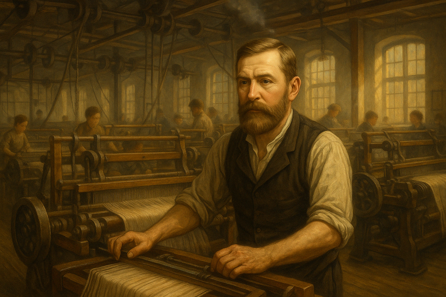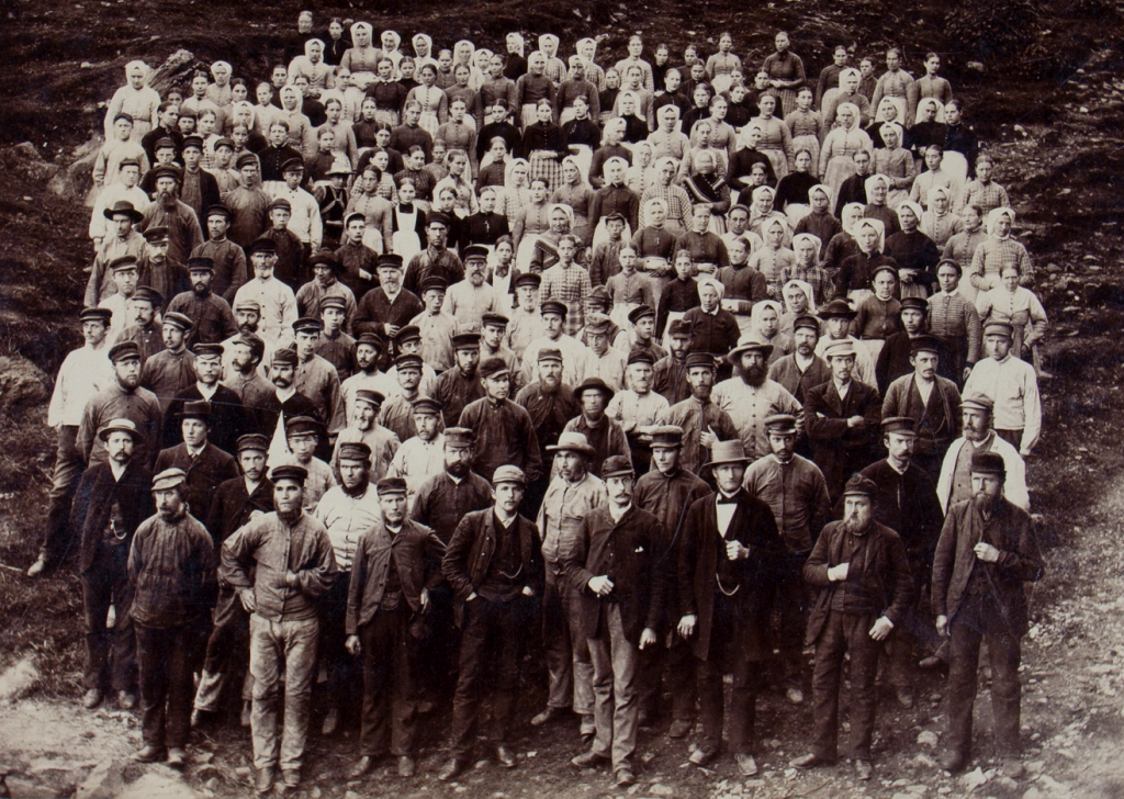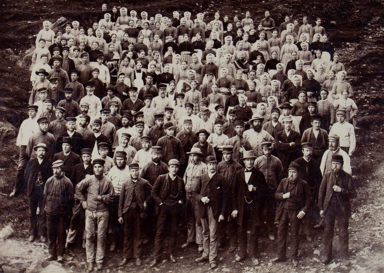 Arbeidere ved Arne Fabrikker i 1891. Det var ikke uvanlig at hele familier – menn, kvinner og barn – arbeidet sammen i tekstilindustrien på slutten av 1800-tallet. Ole Brudvik selv begynte som ung arbeider og steg i gradene til maskinmester ved fabrikken.